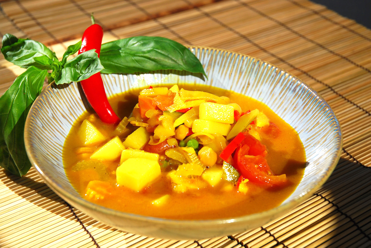 First, wash the vegetables and cut them into small pieces. Step 1. Heat two tablespoons of olive oil, coconut oil or ghee and add half a tablespoon of mustard seed, frying them until they pop. Step 2: Add spices and vegetables to the pan or pot, stir for 2 minutes then reduce the heat. Step 3: add liquid, e.g. an appropriate vegetable juice, coconut milk or broth. Season to taste. The cooking time for the curry or ragout is 10 to 15 minutes, for the soup 30 minutes.