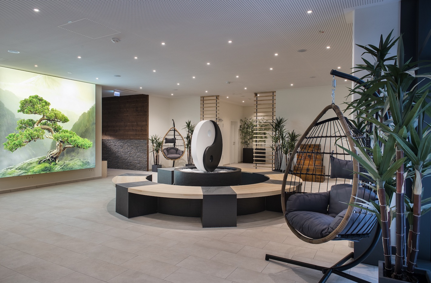 Den perfekten Rahmen für das Finden seiner persönlichen inneren Mitte bildet dabei der zweigeschossige Wellnessbereich „5 Elemente Asia SPA und Lebensstil“, designt von Innenarchitektin Angelika Wanninger. Im Jahr 2022 neu fertiggestellt, finden Gäste dort auf einer Fläche von 6.500 qm sechs Pools und neun verschiedene Saunen – vom Sole-Dampfbad bis zur Hüttensauna auf der Dachterrasse mit wohltuenden Kräuter-Aufgüssen. Ein Highlight ist der 25 Meter lange Infinity-Außenpool, der sich nicht nur bestens für Panorama-Selfies eignet, sondern einem auch das Gefühl schenkt, direkt in die Wolken hinein zuschwimmen. Wie passend, lautet doch der Ortsteil, in dem sich das Hotel befindet, Himmelreich!